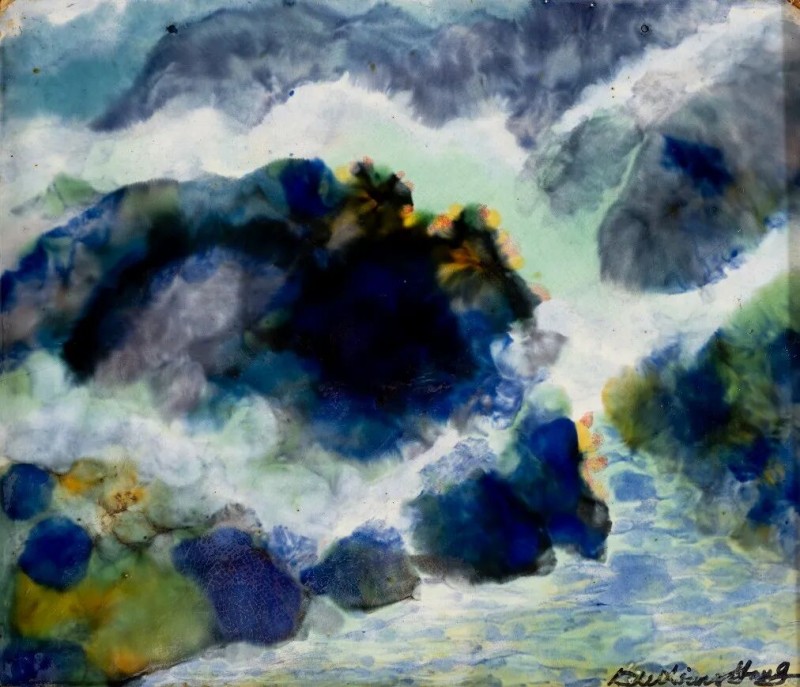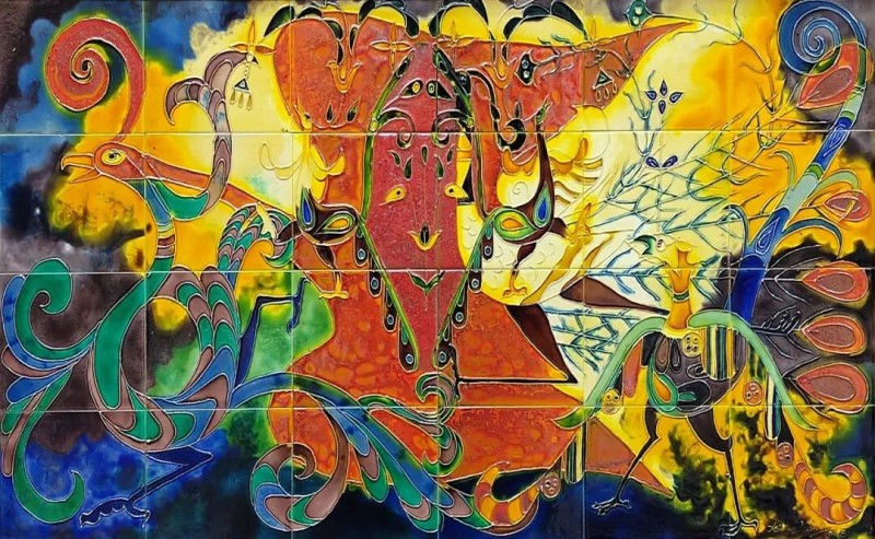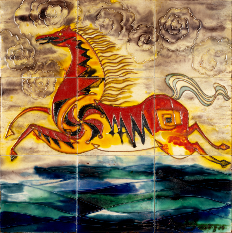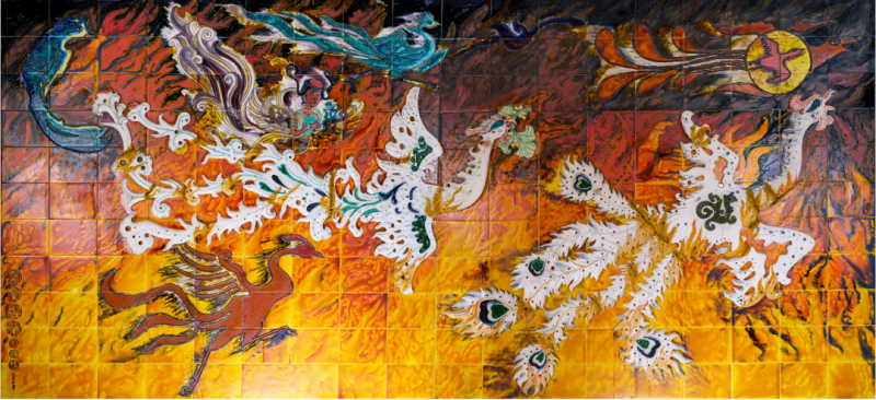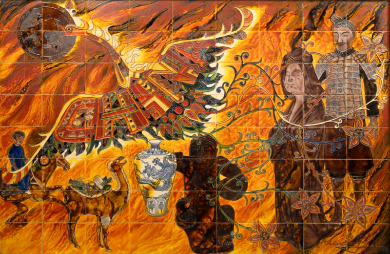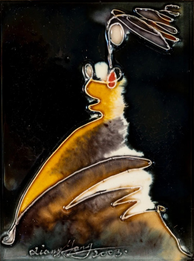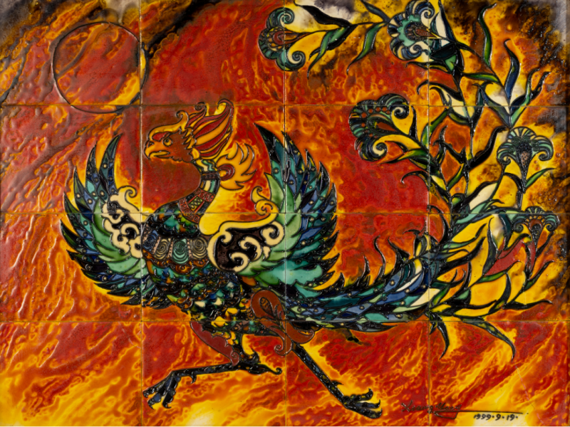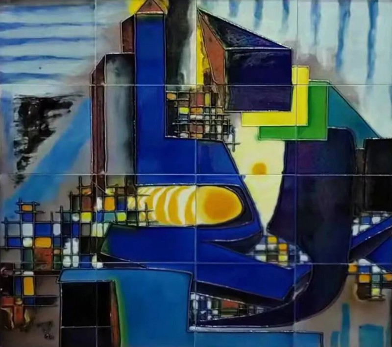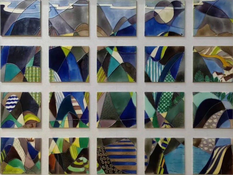 釉的本质属于陶瓷,是外在的视觉元素。独具的光泽、色彩、纹饰、肌理和天然装饰性,是釉的质与色之美。唐代工匠为获得理想的釉色,耗尽其毕生智慧,终于创造出登峰造极、华丽润泽的三彩釉。此釉既然可以作为陶瓷的外装饰,为何不能将其平面绘画呢?1982年,原中央工艺美院肖惠祥老师于《美术》第9期发表《用唐三彩做平面画》的文章,其三彩平面画作品虽赴美无果,但三彩瓷砖釉烧工艺在我国北方却已广泛流行。