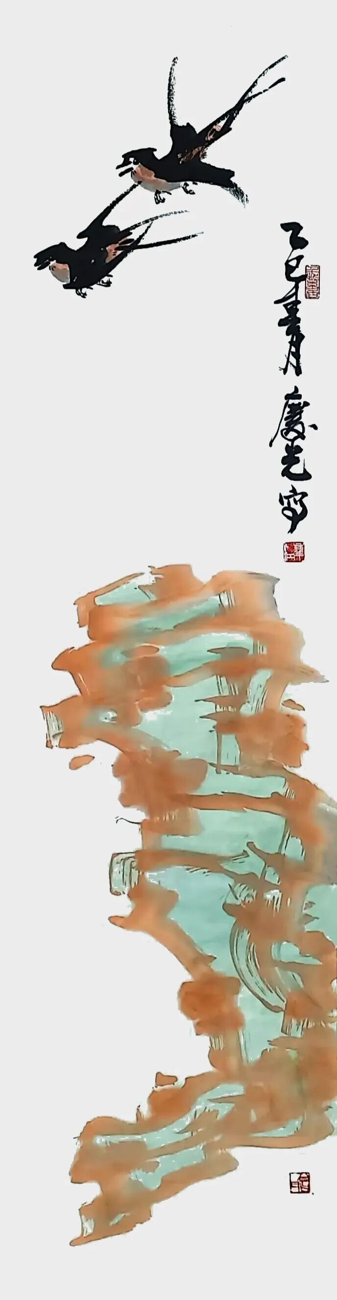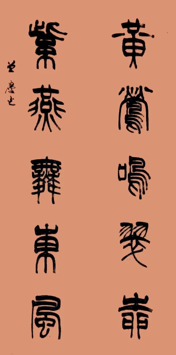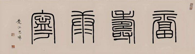 曾庆江的艺术之路,始于对齐派花鸟画的师承,却并未止步于技法的娴熟。他深谙中国文人艺术“书画同源”之精髓,很早就将目光投向了更深的根基——书法与国学。这是一次由“画”向“文”的自觉溯洄。他从清篆入门,继而探源大篆、秦篆之古朴浑厚,复又浸淫于隶、楷、行诸体,在金石碑帖间磨练笔力,涵养气格。这种对书法的深耕,使其绘画获得了内在的骨力支撑,真正做到了“以书入画”,笔下的花卉翎毛,既得形神之妙,更富笔墨本身的节奏与张力。