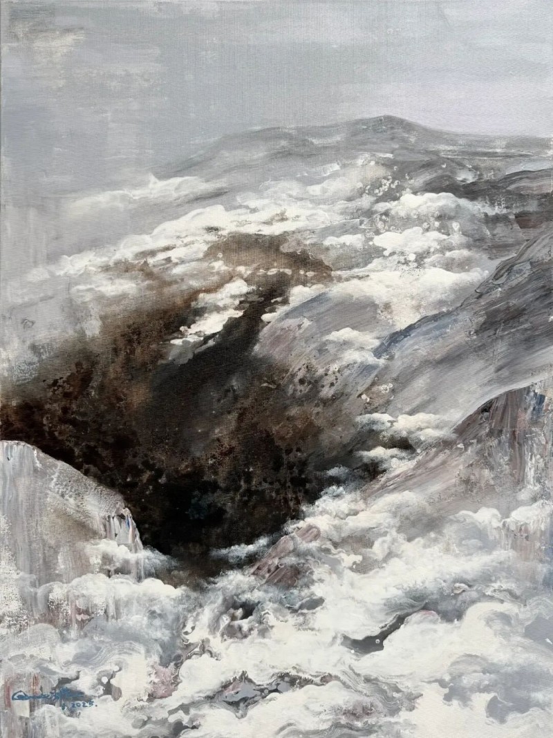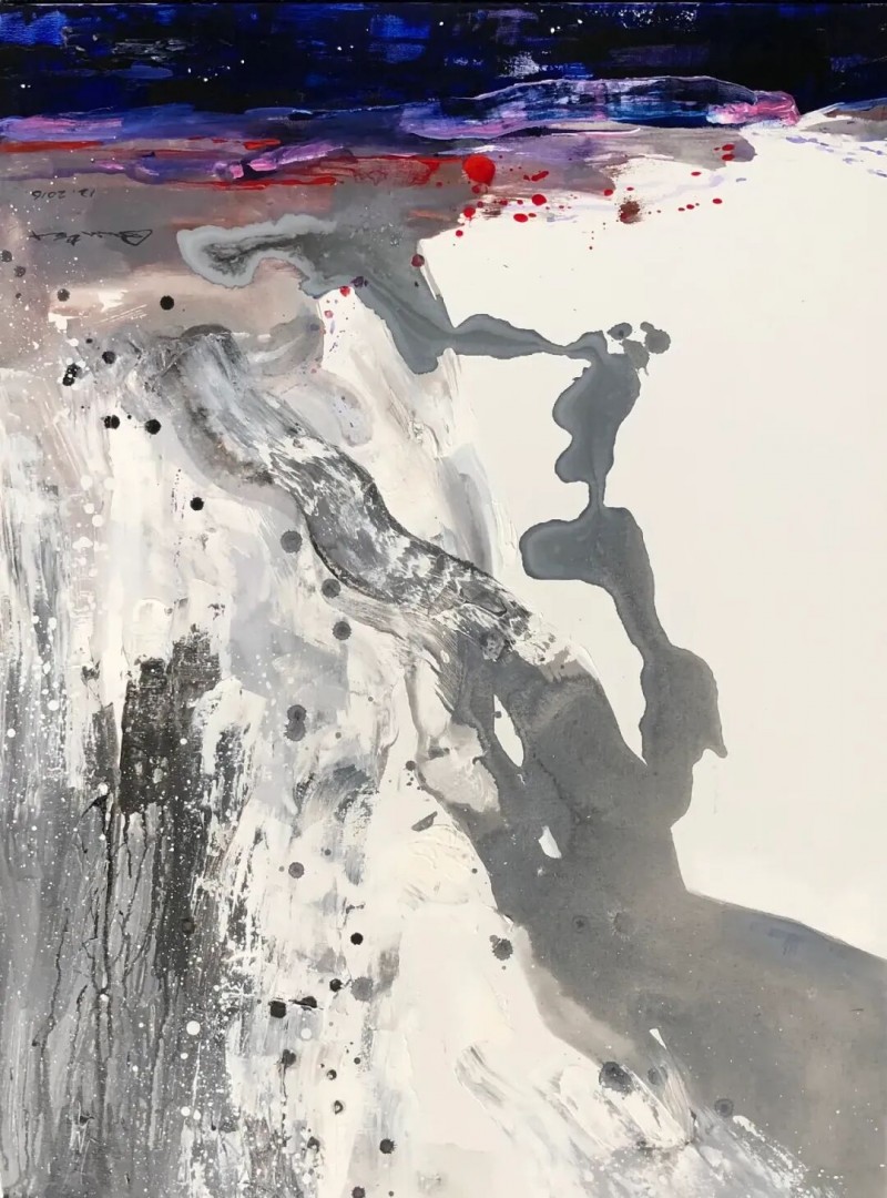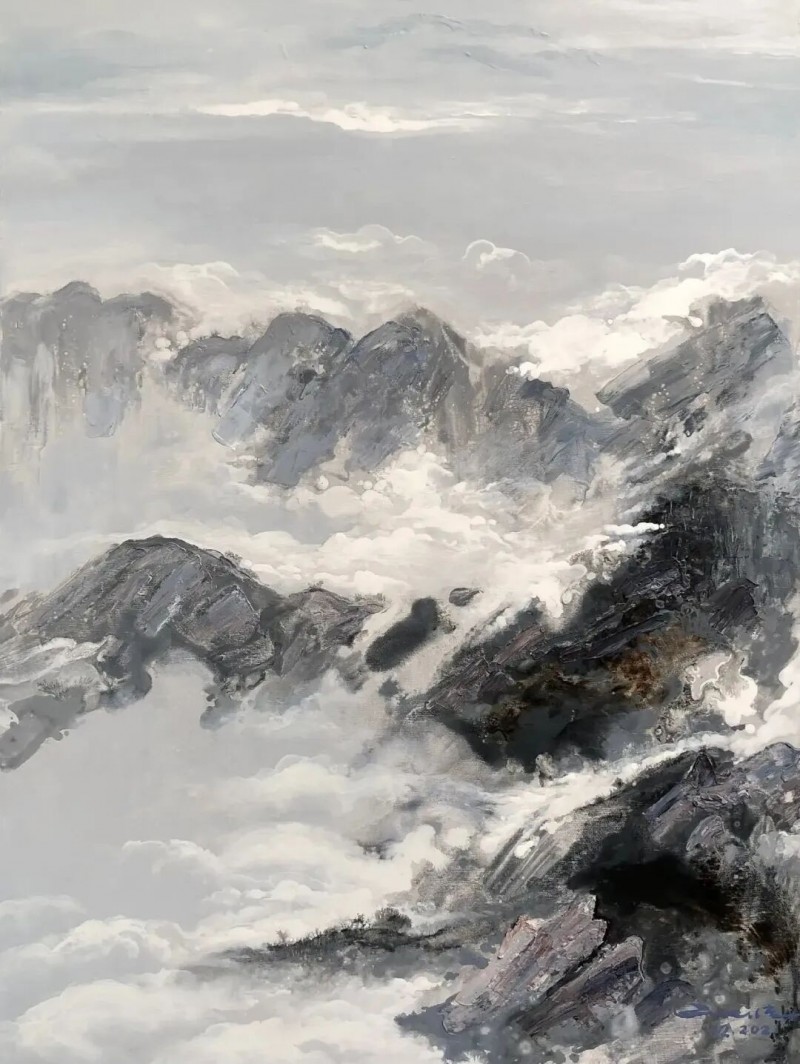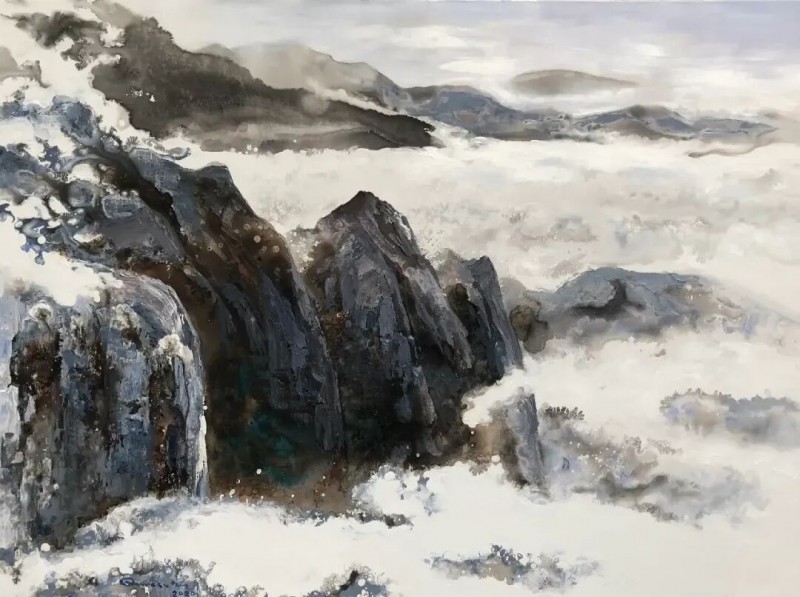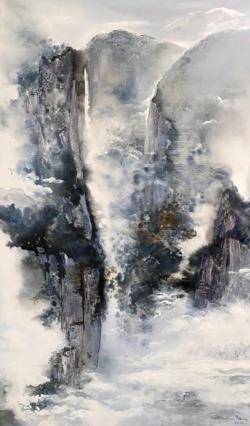 他的绘画发展可以分为三个方向,第一个是以综合材料表现水墨精神,将抽象与传统山水画完美融合,主要以灰、白色和细腻的土色调,来表现山脉的粗犷地形和风起云涌的狂野动态。画作中巧妙地平行了流动性与稳定性,让观者既能感受到大自然的巨大力量,又能体会到作品中那弥漫着的宁静氛围。他对色彩和形式的运用展现了非凡的掌控力,尤其是那斑驳层叠的岩石质感和水一样流动的云雾效果,使他的作品充满深度,他通过对自然世界的抽象描绘,引领观者深入体验其对自然环境的关怀与沉思。