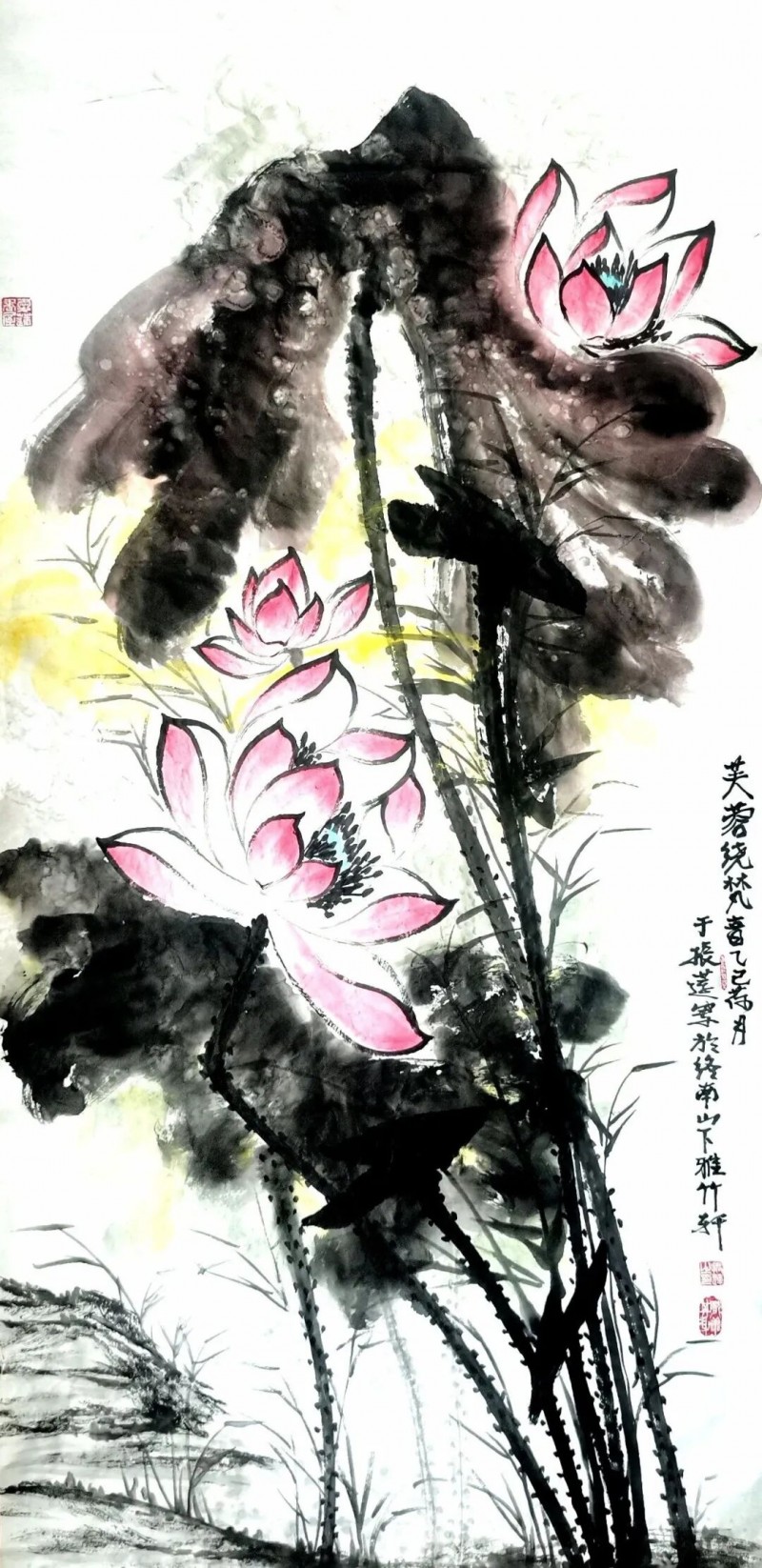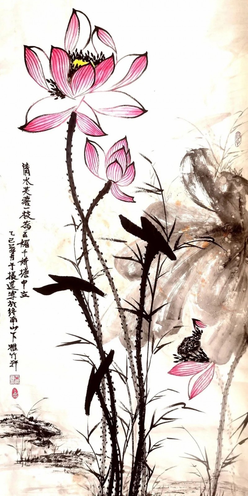 水是一切生命的源泉,荷花也因水而生。无论在理念上还是技法上,于振莲都把用水提升到极重要的位置。“水晕墨彰”,她往往以饱含水分并掌握适度的笔墨,或勾或染,或泼或积,笔随心运,水到图成,或淡而透明,或浓而光泽,或墨彩交融,恰到好处地营造出荷花变化多姿的形态神韵,创造出发人沉思的生命诗境。随机生发的肌理效果,越发增加了水墨艺术的情趣性。水乡之魂,水气氤氲,荷花的柔而润,刚而清,都在水的韵味中发挥得淋漓尽致。于振莲画荷,淡雅而不淡出,自然而不造作,灵动而不拘泥,内秀而不张扬,形成了自己的水墨语言、艺术个性、文化符号和人文特征。她的荷花,有章有法,有声有色,在动态中弥散着安宁,在美育中播撒着和谐。在淡雅中见玄览,在含蓄中见诗意,在平和中见江南。