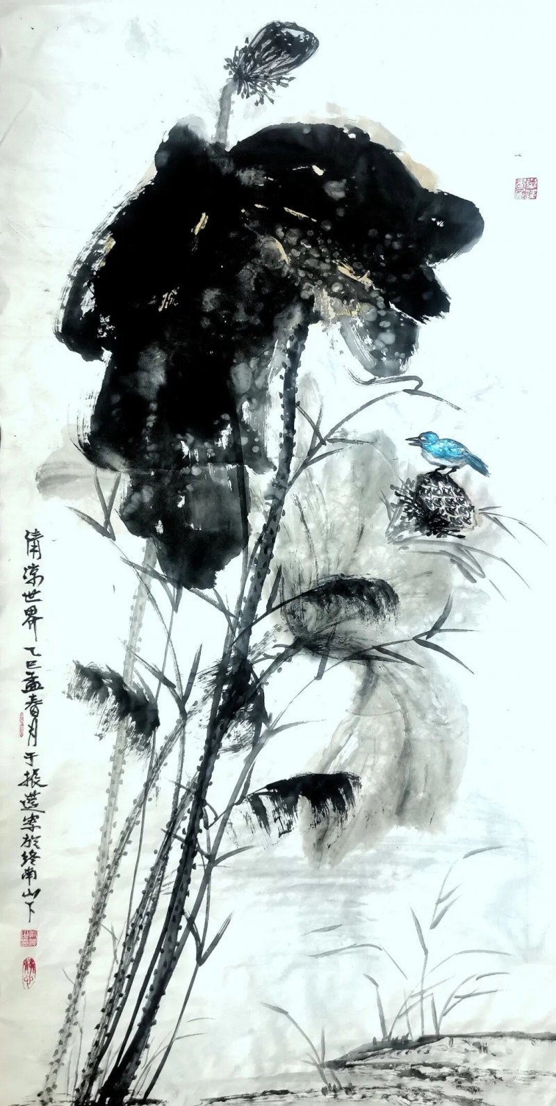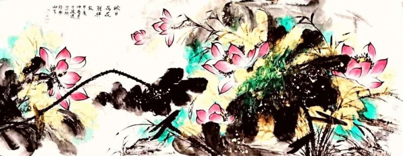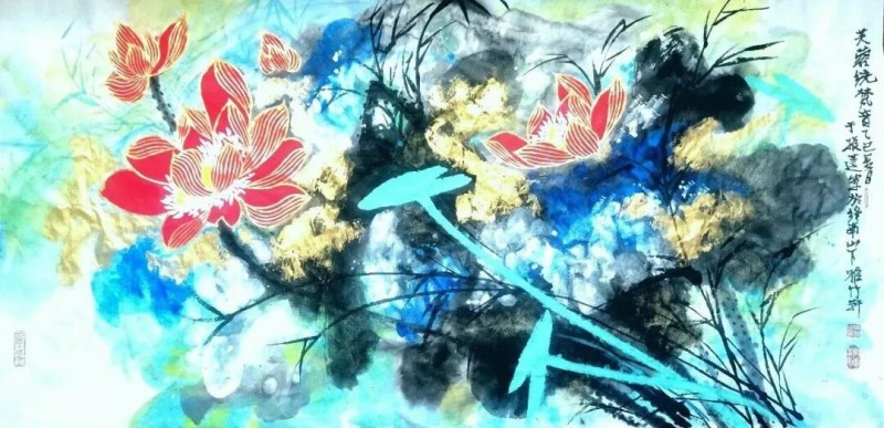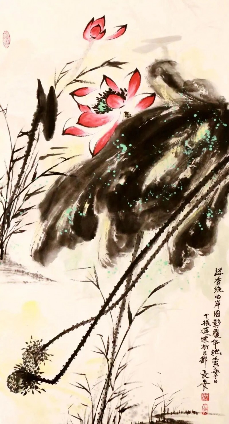 画荷是于振莲国画作品的一个亮点,更是她的文化符号。于振莲笔下之荷,有种清清池水边凭栏四顾的感觉。但见那满池青翠,或傲然出尘,或顾盼着,如语如诉;或恣肆如瀑布式的倾泻于丽日朗照之下;或轻盈地飘摇在清风中,其墨叶,浓的蓊然沉郁,淡的洒然飘逸,浓浓淡淡间,纯粹得恍若天地鸿蒙,中锋粗壮而不涩滞,侧锋空灵而不枯扁,亭亭的荷茎和荷芰生机勃勃地滋长蔓延着,支撑着生命的绚烂绽放。粉黛出水.天生丽质似亭亭玉立的仙子在碧波中美目流盼。草下游动的小鱼.掠过水面的蜻蜓.微风骤起,掀起一片绿浪,送来阵阵荷香……