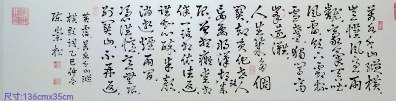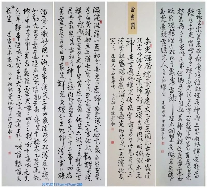 草书《滕王阁序》、《道家三大金光咒》、《陋室铭》、《水调歌头.中秋》、《沁园春.雪》;行书节录《谏太宗十思疏》、自撰文书法作品有《柬缅电诈降罚记》、《乙巳京师阅兵记》、《英之园圮毁记》、《齿疾小记》、《观书法群落展记》等。其作品入编中国文化出版社《中国书画通史》,中华英才网、中国经济报导网等媒体网站曾对其书法作品进行宣传报道。