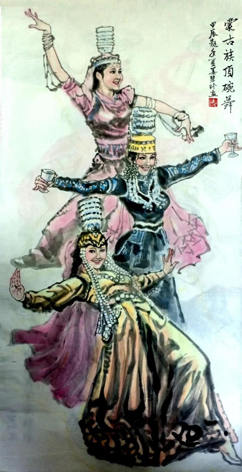 《蒙古族顶碗舞》四尺整纸姜碧玲原创于甲辰龙年夏