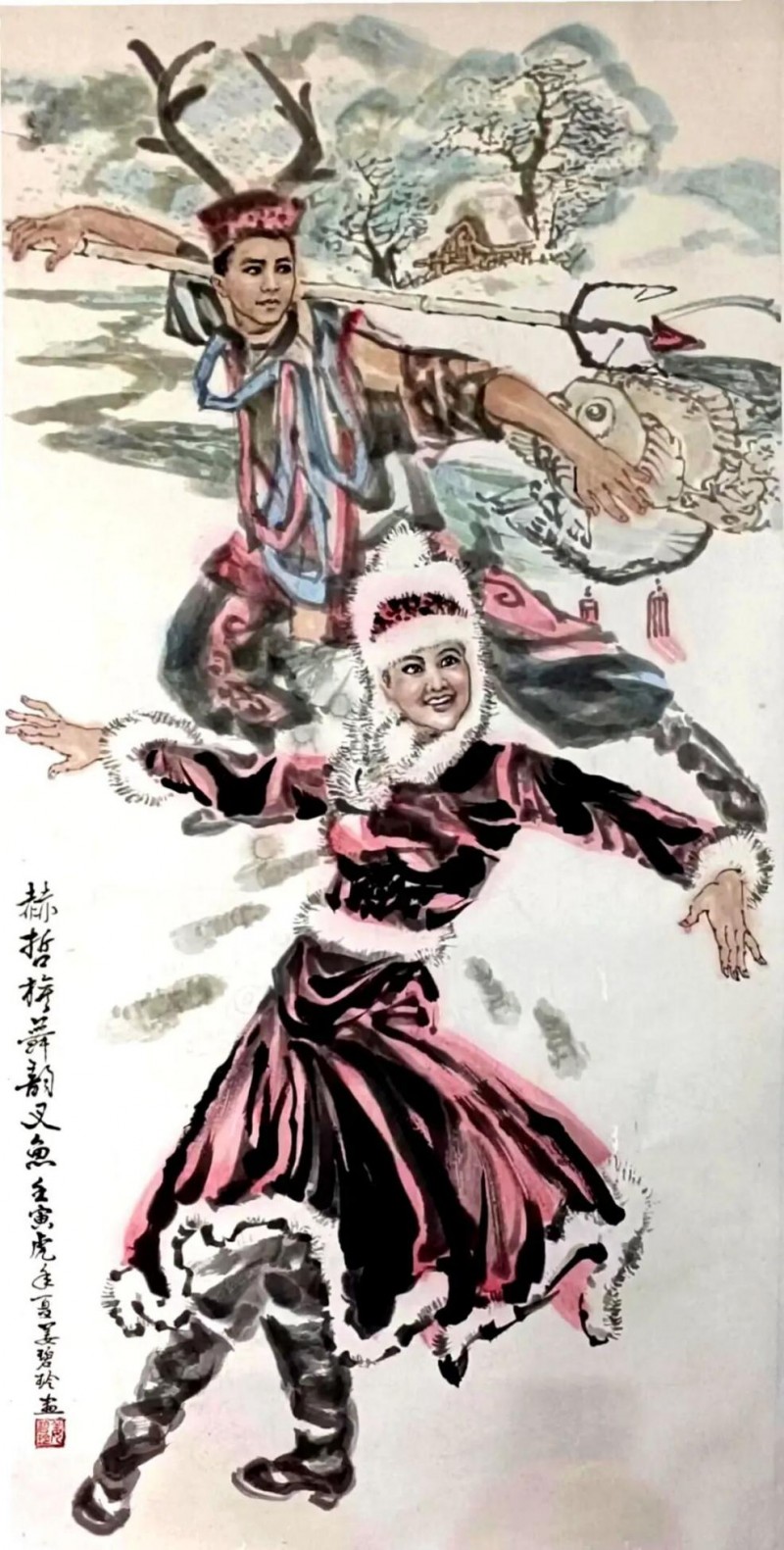 《赫哲族舞韵叉鱼》(四尺整纸)姜碧玲原创于壬寅年夏