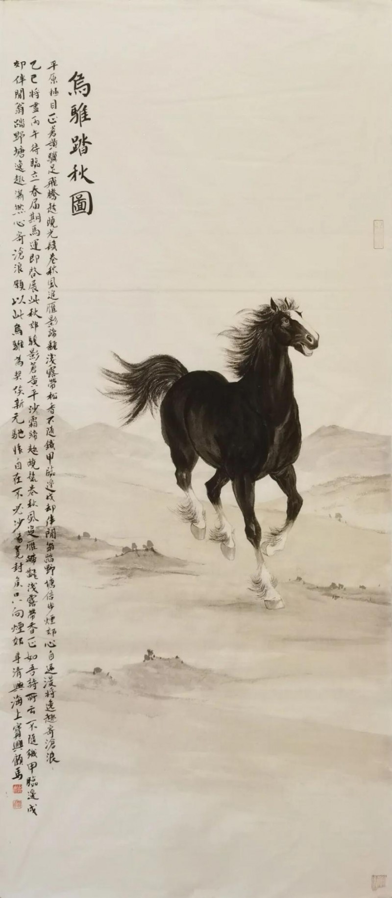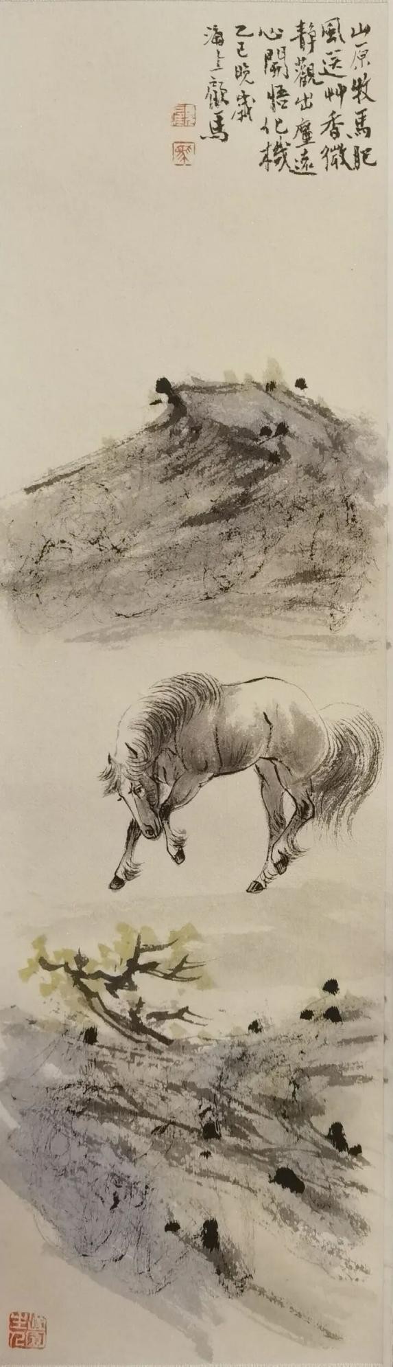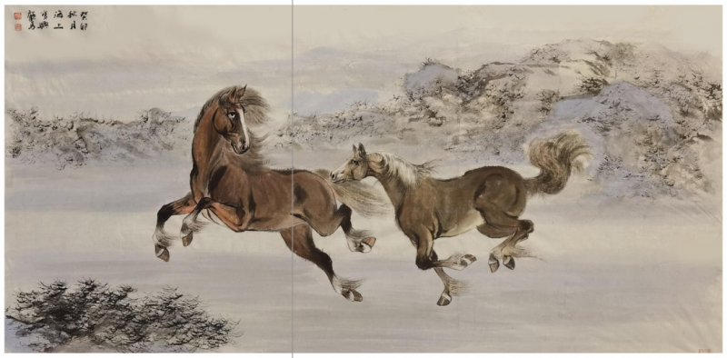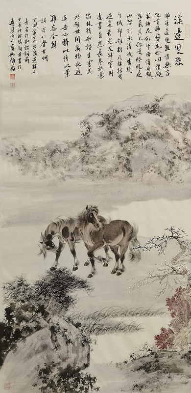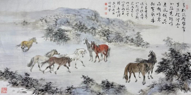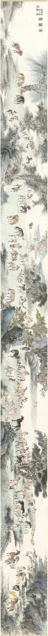 这一点,顾马兄是极明白的,故而近年来,画马之妙固然有精进,传承海派名家胡成荣之艺,亦多汲取古贤如唐之韩幹、宋之李公麟,元赵孟頫,以及清之郎世宁诸家的形神线条,近现代画马名家之精神,工写兼合,渐成一家路数。那卷耗十六载而成的《百骏图》手卷,便是他多年浸淫马题材创作的心血结晶,卷中每一匹骏马皆有性情,每一处笔墨皆含匠心,长卷舒展时,如见群马踏春而来,雅意满溢。而那卷跨蛇年至马年创作的新《百骏图》,更将是他审美理念的又一次沉淀与表达。作为内心所寄,他的山水画作近时也渐多了起来,其中为武汉辛亥革命纪念馆创作的山水画《远山》巨制,尤为人所称道。山水手卷《秋山明远图》,则以文人的妙悟,曲尽江南山水之道,或可视为其近年来写山水的得意之作。