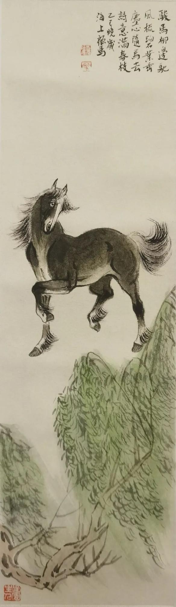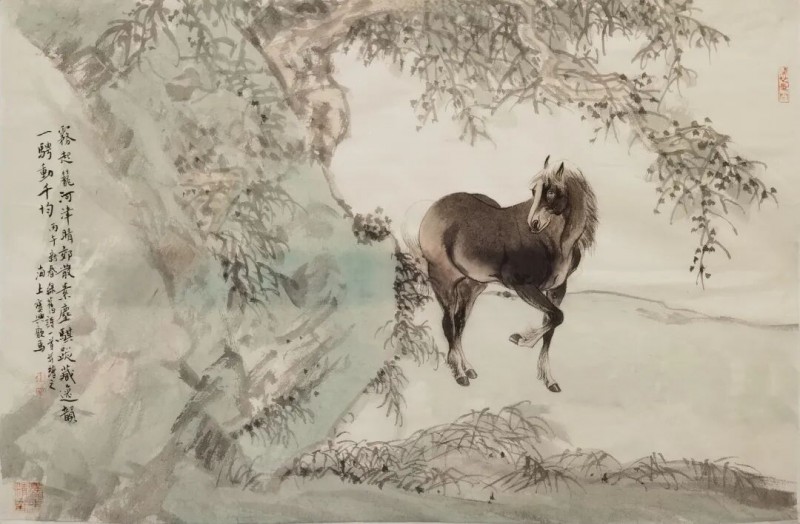 因为他是一个俗世间的文人,所以他的画作,相对于只求一味高冷、野逸的画家之作而言,可能更见得其于俗世里的亲情与雅意融合的审美意味,不为之玄奥,亦不沦落庸俗,平常的生命欢喜中有一份出尘的雅意流淌,这便是俗世生活里汲养自我审美情趣的由来和好处,不为孤寂误,也不随俗流漂。这样的文人特质,大抵是属于比较通达一类的。故而读顾马兄笔底云水间的风萧萧,芳草地上的徘徊,金戈阵阵,温婉思远,神骏电驰,骅骝列阵,都是其出于俗世的心头寄托,读来多的是人间世的一种温情或奋发。